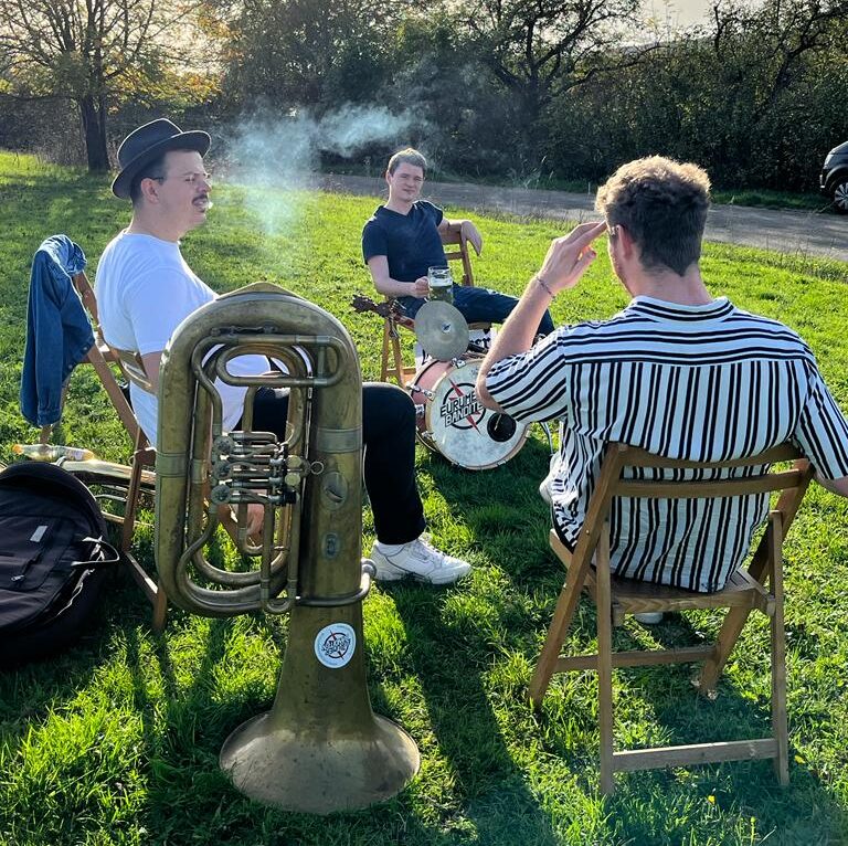 Einen Namen und eine „Uniform“ hatten wir nun schon mal, doch wir hatten noch keine Ahnung wie unsere Musik klingen sollte. Bei unserer ersten Probe spielten wir einfach drauf los, Maximilian und Konstantin Tenorhorn, Christoph Saxophon und Lorin Marschtrommel. Es war… schlicht gesagt: es war Mist; es klang fürchterlich. Nicht, dass wir gänzlich falsch gespielt hätten, doch wir hatten nicht damit gerechnet, wie wichtig ein passendes Arrangement für eine Vier-Mann-Kapelle sein kann. Bis zum nächsten Treffen baute Konstantin eine Teufelsgeige für Lorin und Maximilian begann Posaune zu lernen. So schafften wir es dann nach einigem Hin und Her unsere Besetzung aufzubessern und einen ganz eigenen Stil zu erfinden, ohne Akkordeon, Klarinette, Trompete und Co.!